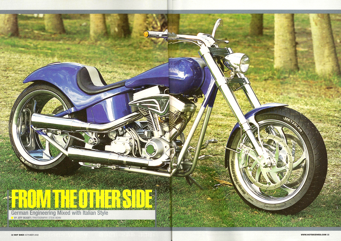 Since a great deal of Eurocomponents parts come from Europe, as you may have guessed by the company name, Lorenzo has contacts that sprawl across that continent. One of these associates, Speed-Point in Germany, was given the task of building Lorenzo’s bike – e-mails and faxes began to cross the Atlantic. They started with a German-made UHS Softail-style frame and matching swing arm. A Works Performance frontend was added to the 38-degree frame neck, backed up by a pair of Progressive Suspension shocks taking up residence beneath the chassis. Lorenzo used a pair of his own wheels and added something new from his catalog – ceramic brake rotors. These new rotors are made by adding 20-percent silicon carbide (the ceramic substance) to the metal, giving them better braking and higher heat resilience before fading. Of course, Eurocomponents calipers were used – a pair of six-piston units up front, followed by a pulley/rotor system clamped on by another six-piston caliper at the back.